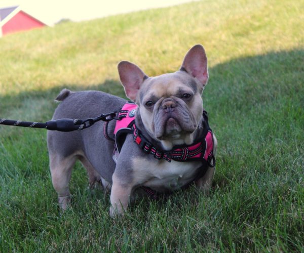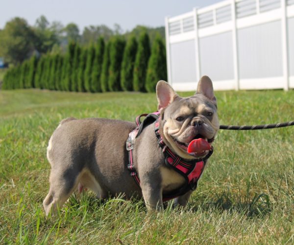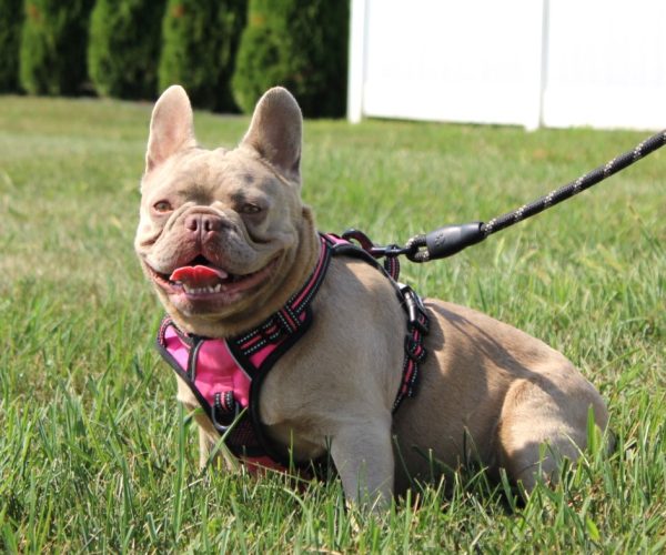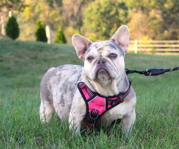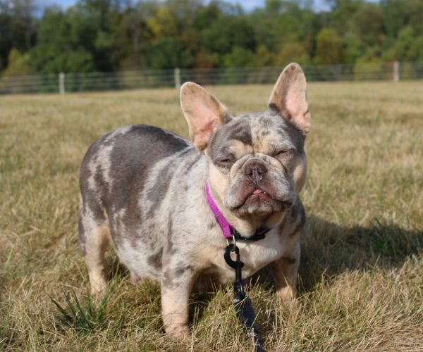 Wanda is our gorgeous Boogie daughter! She is a chocolate and tan merle. Her personality is like a Frenchie man’s dream! She is super late back and loves to go on her morning walks!